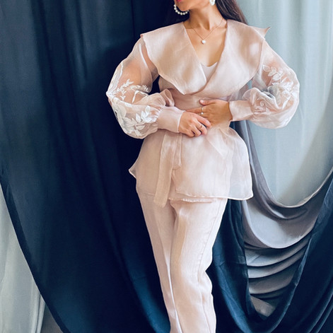 Three-piece organza set: comes with a bustier, matching pants, and a stylish organza jacket. The jacket is hand-painted, has a cape-style collar, and an adjustable belt for the perfect fit.