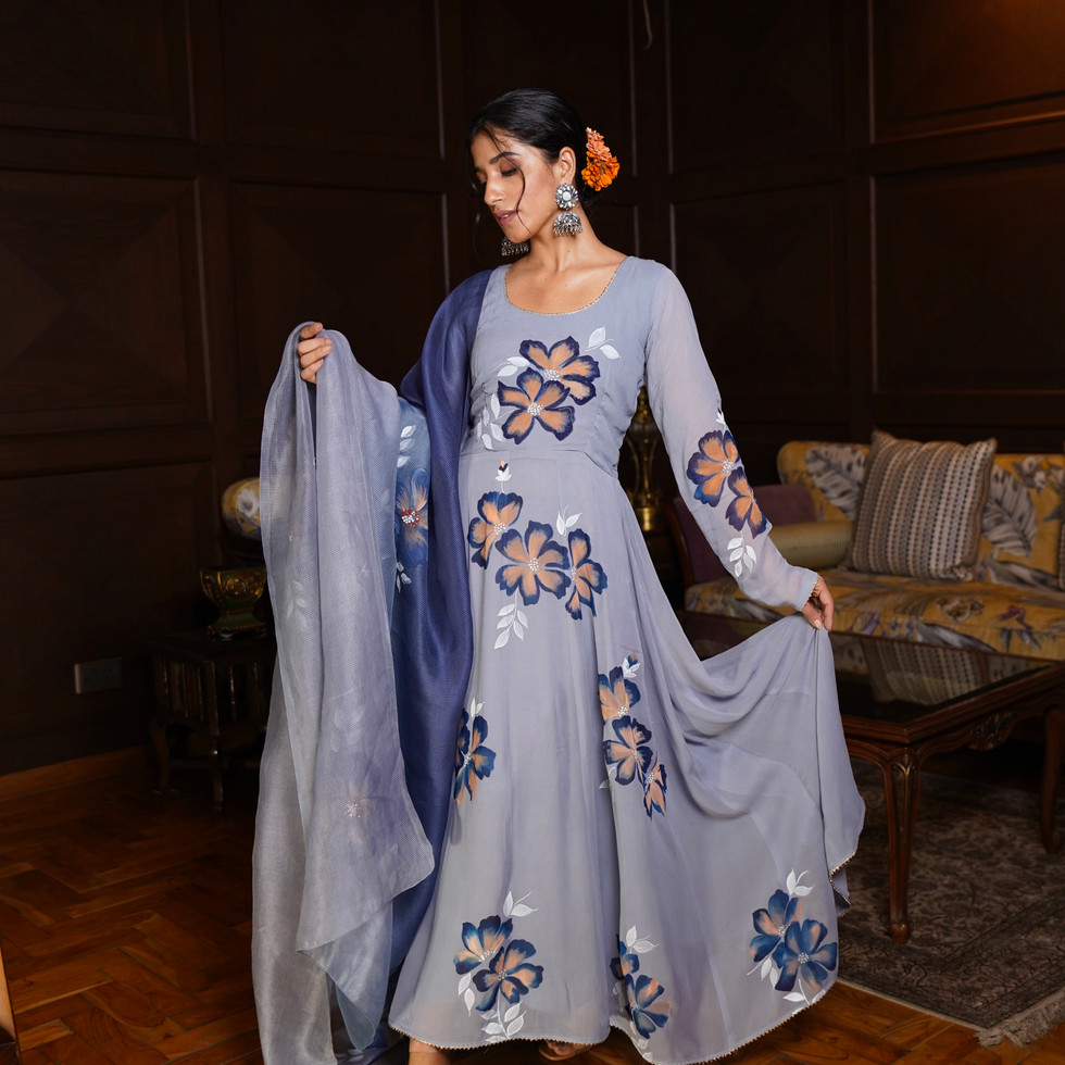 Step into the ethereal world of this hand painted anarkali suit on pure georgette fabric in cool grey. Adorned with handpainted flowers in enchanting hues of blue and peach. The suit is paired with a Kota Doria dupatta, beautifully blended in shades of grey and dark blue, the handpainted flowers on the dupatta are accentuated with intricate sequin work detailing. Vibrant, lightweight, playful, festive, and undeniably elegant a captivating addition to your collection.