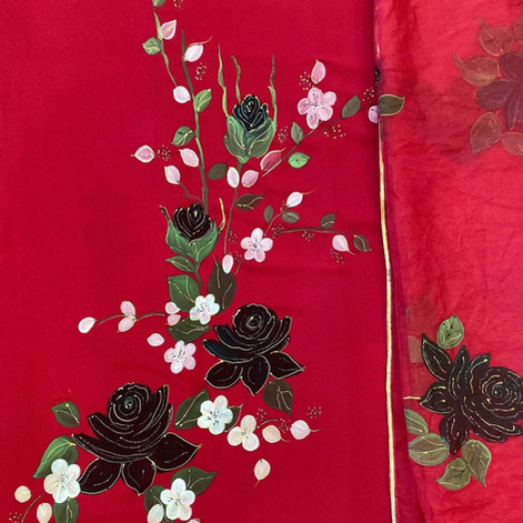 Ignite your festive spirit with our handpainted suit. Crafted on georgette fabric in a captivating shade of red, this suit showcases handpainted roses enhanced with intricate detailing paired with handpainted organza dupatta. The striking combination of black on red creates a stunning ensemble that exudes charm and elegance.